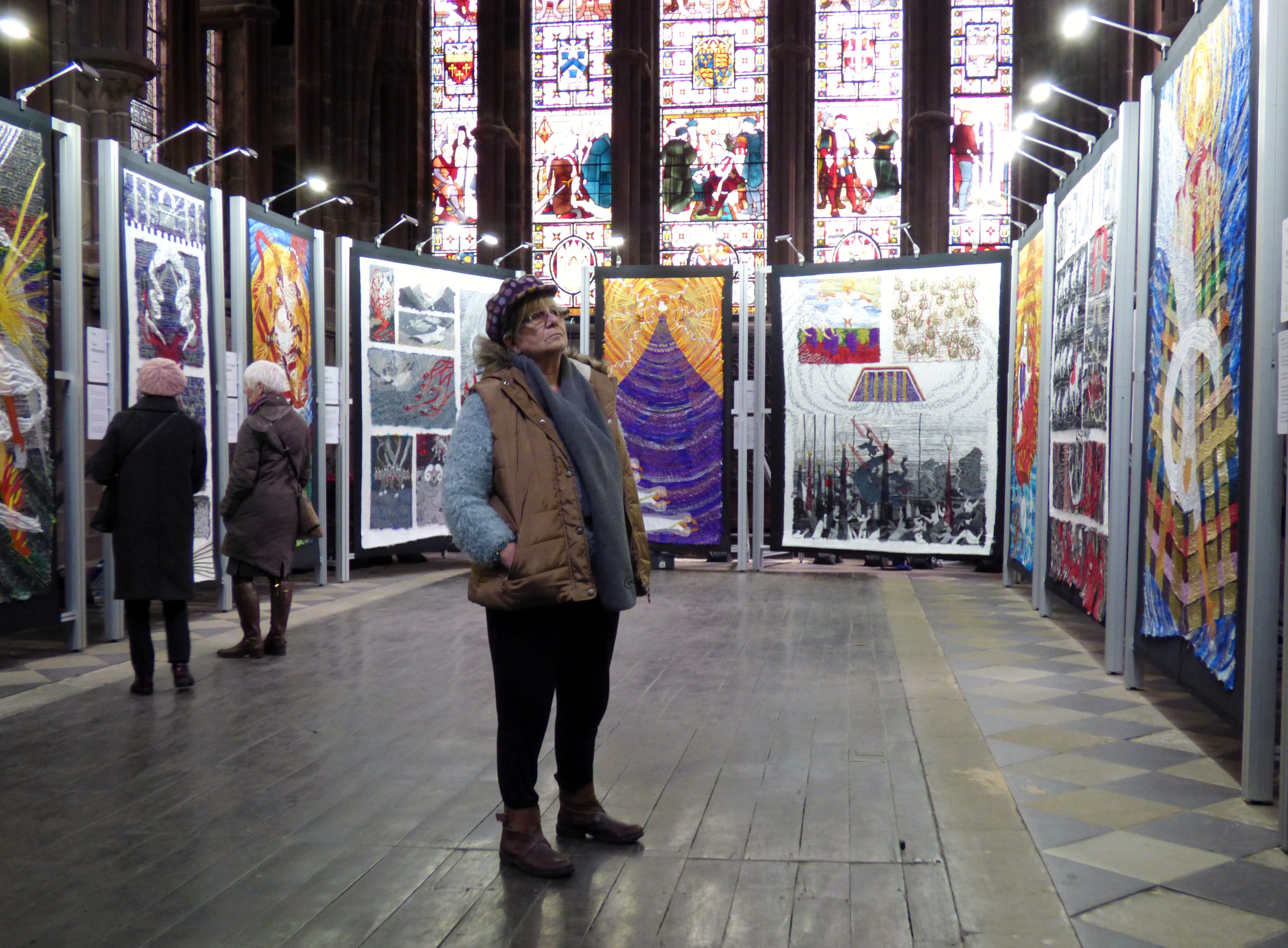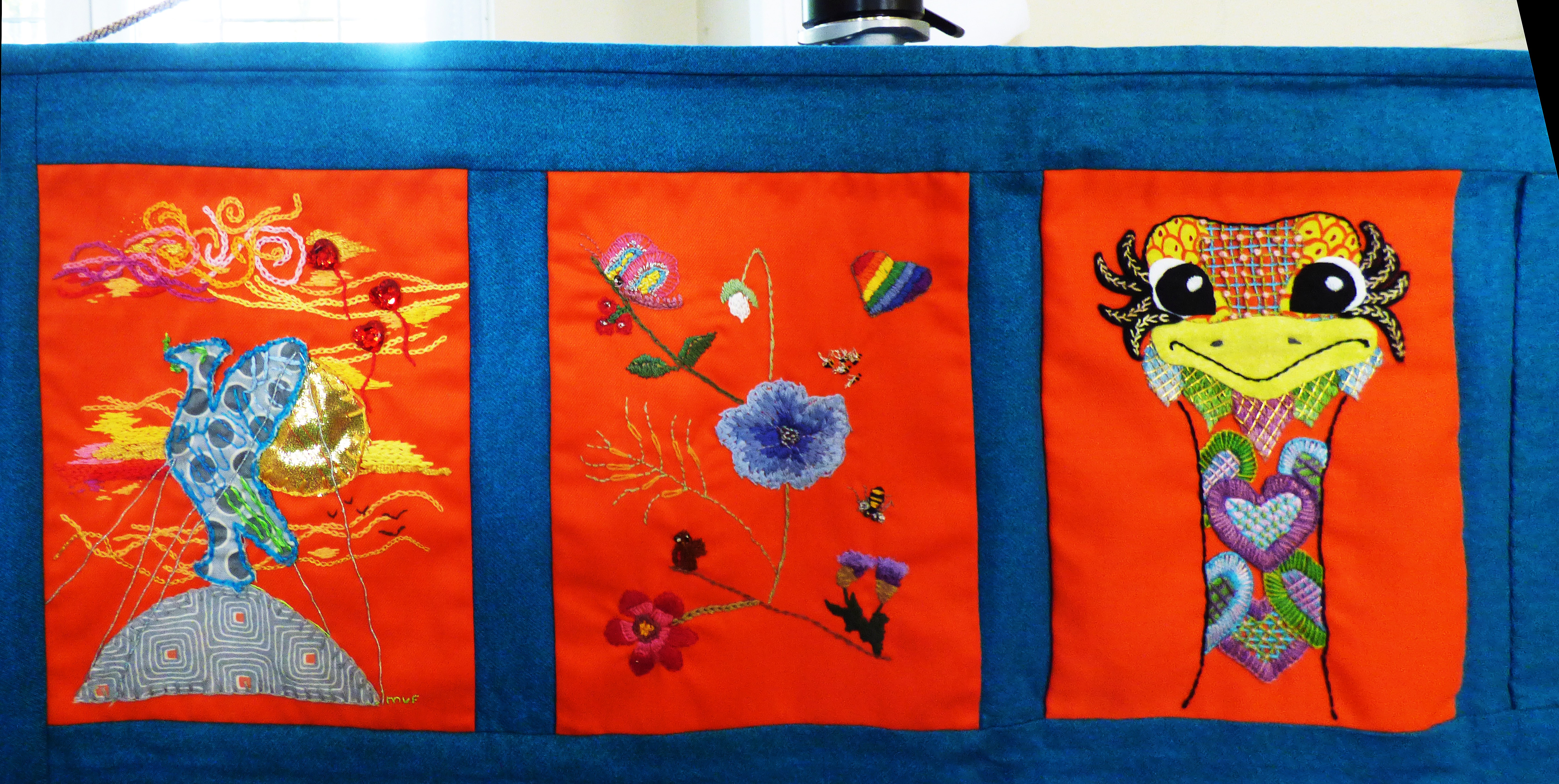 Here are the completed banners for Merseyside Expressive Stitchers’ group. Many thanks go to all members who embroidered the beautiful squares, and thanks to those members who spent hours assembling the banners and doing the final stitching towards completion. We are very happy with the final result.