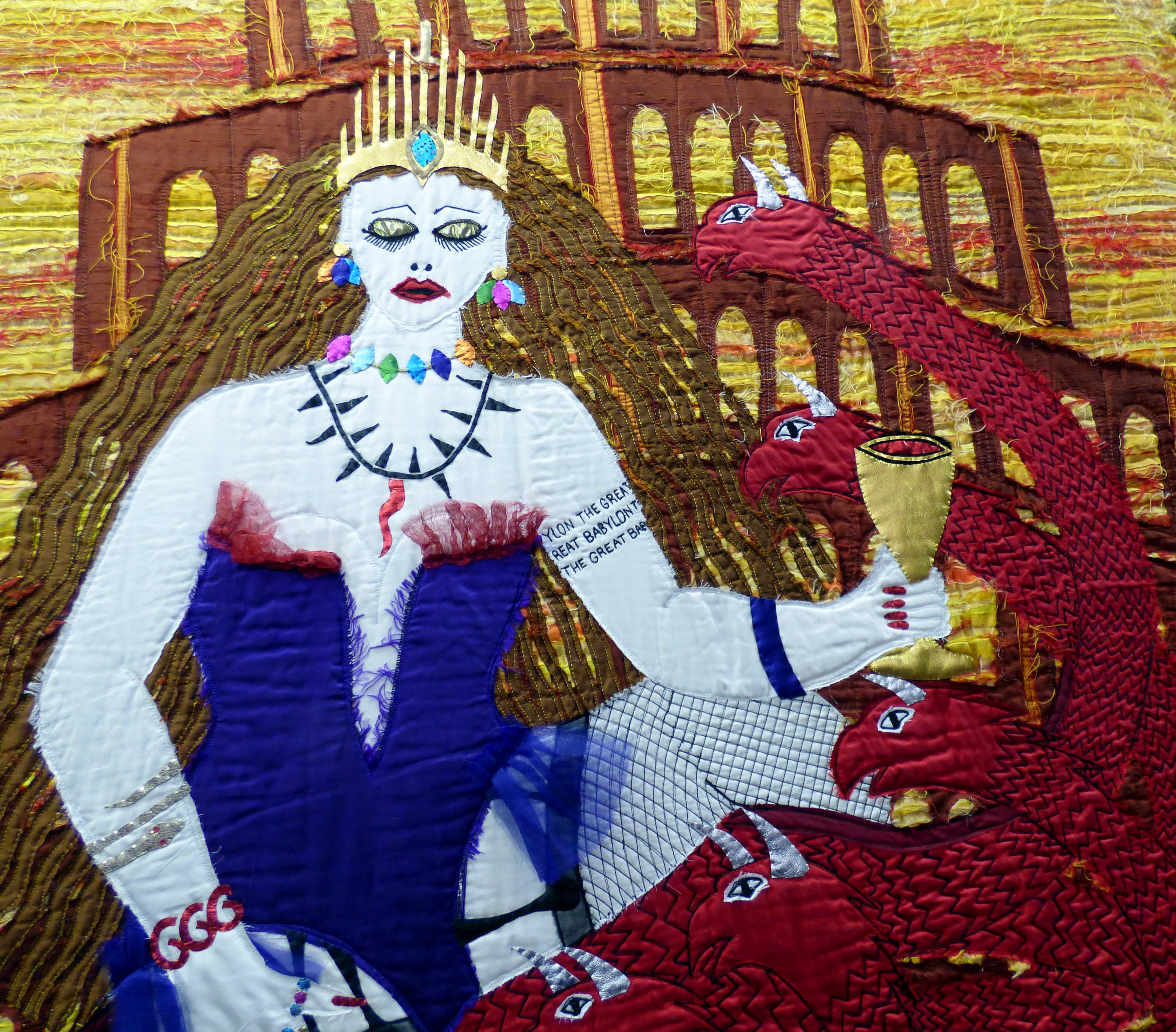 Following our AGM in October we had the pleasure of hosting Nikki Parmenter. The branch was pleased to welcome back Nikki Parmenter on 18th October 2025. Several years ago, Nikki talked about her work and held an exciting workshop using innovative mixed media techniques. Her talk this time concentrated on her interest in the myths and stories of different belief systems around the world. We were treated to a display of colourful, multi-layered pieces that showed how her work has developed over the years. Looking closely at the many samples, we could see the use of recycled materials, such as curtain hooks and paper clips, as well as painted and sewn cloth, plastic and funky foam, to make both large and small pieces. All demonstrated a love of story-telling and beautiful artwork. No wonder Nikki has won several prizes, including the national Members’ Challenge for the Embroiderers’ Guild. We are looking forward to learning some of the techniques in a workshop next April. in the meantime you can see more photos of Nikki Parmenter’s work here