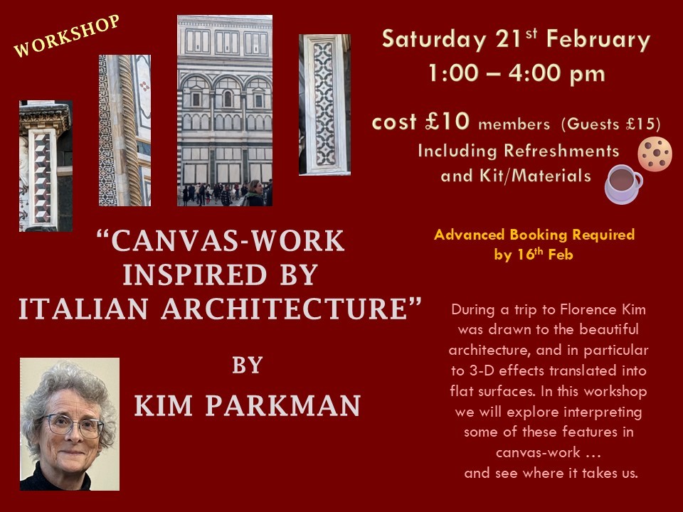 In February Kim will present a workshop entitled, “Canvas-work Inspired by Italian Architecture”. This has been inspired by observations during a trip to Florence where Kim was drawn to the beautiful architecture, and in particular to 3-D effects translated into flat surfaces. We will start by constructing a cube on fabric and exploring shading and infill stitches. Then we will interpret some of these features in canvas work…and see where it takes us. The ideas in your kit are just the start of a new stitch journey. Please bring your basic sewing kit, all you need for the workshop will be supplied.