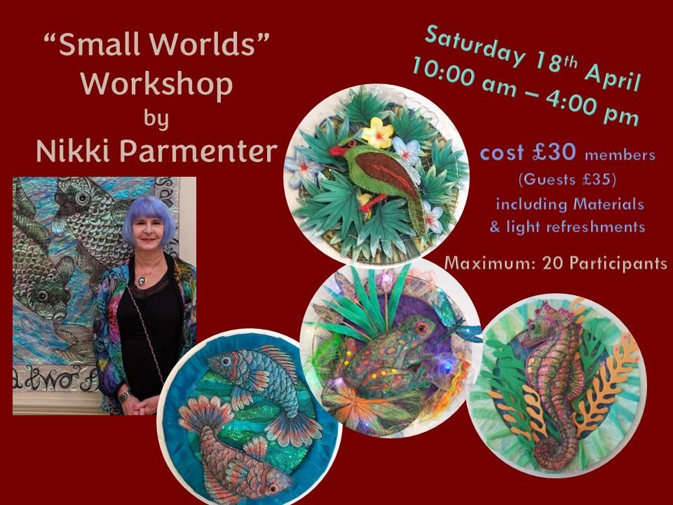 Nikki Parmenter is a Cheshire based artist who specialises in mixed media, textile-based pieces; she takes her inspiration from a variety of sources. At our AGM in October of last year, Nikki gave an excellent talk and showed numerous examples of her creations. By popular demand, Nikki is returning in April to give a workshop entitled, “Small Worlds” in which she will teach us how to create some of her stunning effects whilst we make a unique piece of our own. A choice of templates, including fishes, seahorses, butterflies, turtles, birds and frogs will be available. The workshop can involve free-machine embroidery, hand embroidery or a combination of both. Of the images shown only the bird is hand-stitched. Workshop Details: Saturday 18th April 2026 from 10 am until 4 pm at All Hallows Church Hall. Cost, including materials and coffee/tea and biscuits, is £30 for members and £35 for guests. All attendees need to bring: a basic sewing kit and their own lunch. Attendees may also bring embellishments such as beads, sequins, etc and/or a sewing machine with a free machine embroidery foot and sewing threads if they wish. Advanced booking requested by 16th March to email: coursebooking@megonline.co.uk. Please indicate if you plan to use machine embroidery, and if so, if you will be bringing a sewing machine.