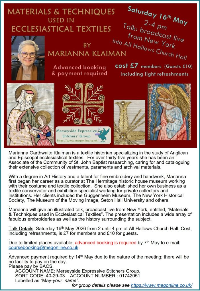 Marianna will give an illustrated talk, broadcast live from New York, entitled, “Materials & Techniques used in Ecclesiastical Textiles”. The presentation includes a wide array of fabulous embroideries as well as the history surrounding the subject.