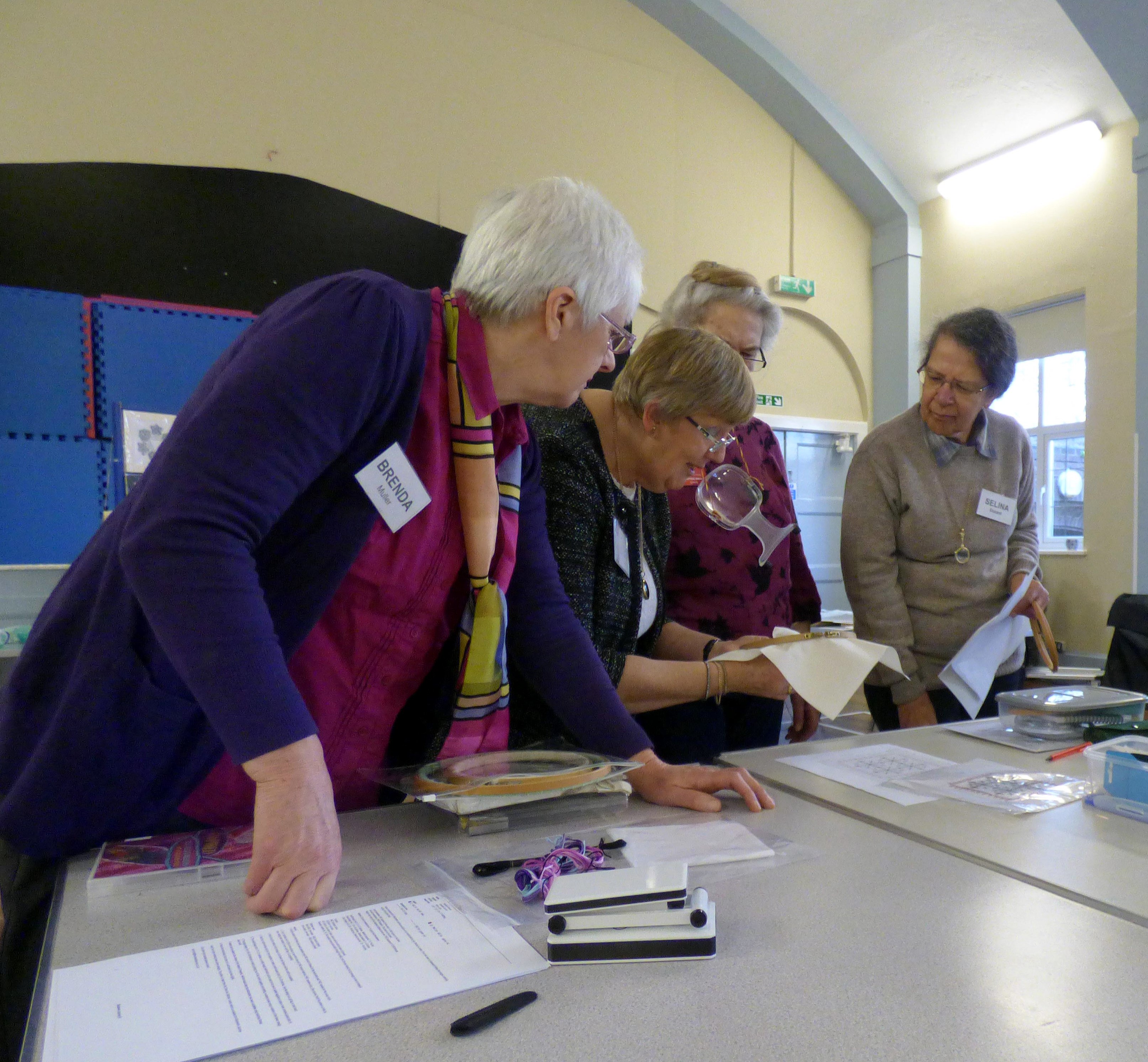 Elizabeth Almond demonstrating blackwork techniques at Blackwork with Elizabeth Almond at Merseyside EG, Nov 2017