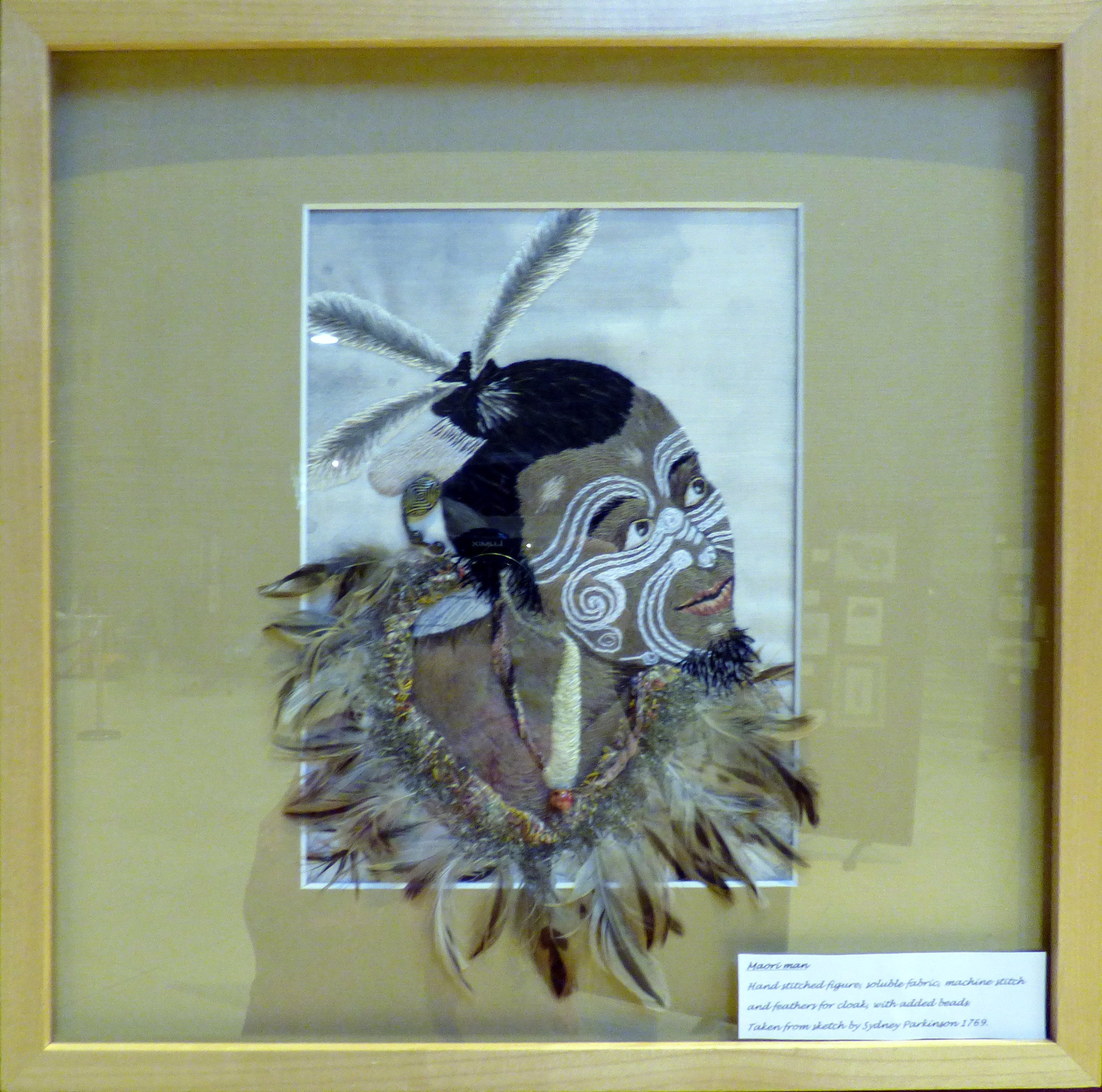 MAORI MAN by Mal Ralston, hand stitch and mixed media, Endeavour exhibition, Liverpool Cathedral, Sept 2018