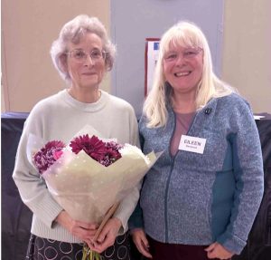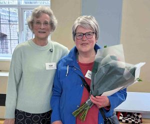 Eileen presenting flowers to Kim who is retiring as Programme Secretary in 2025 after many years of service