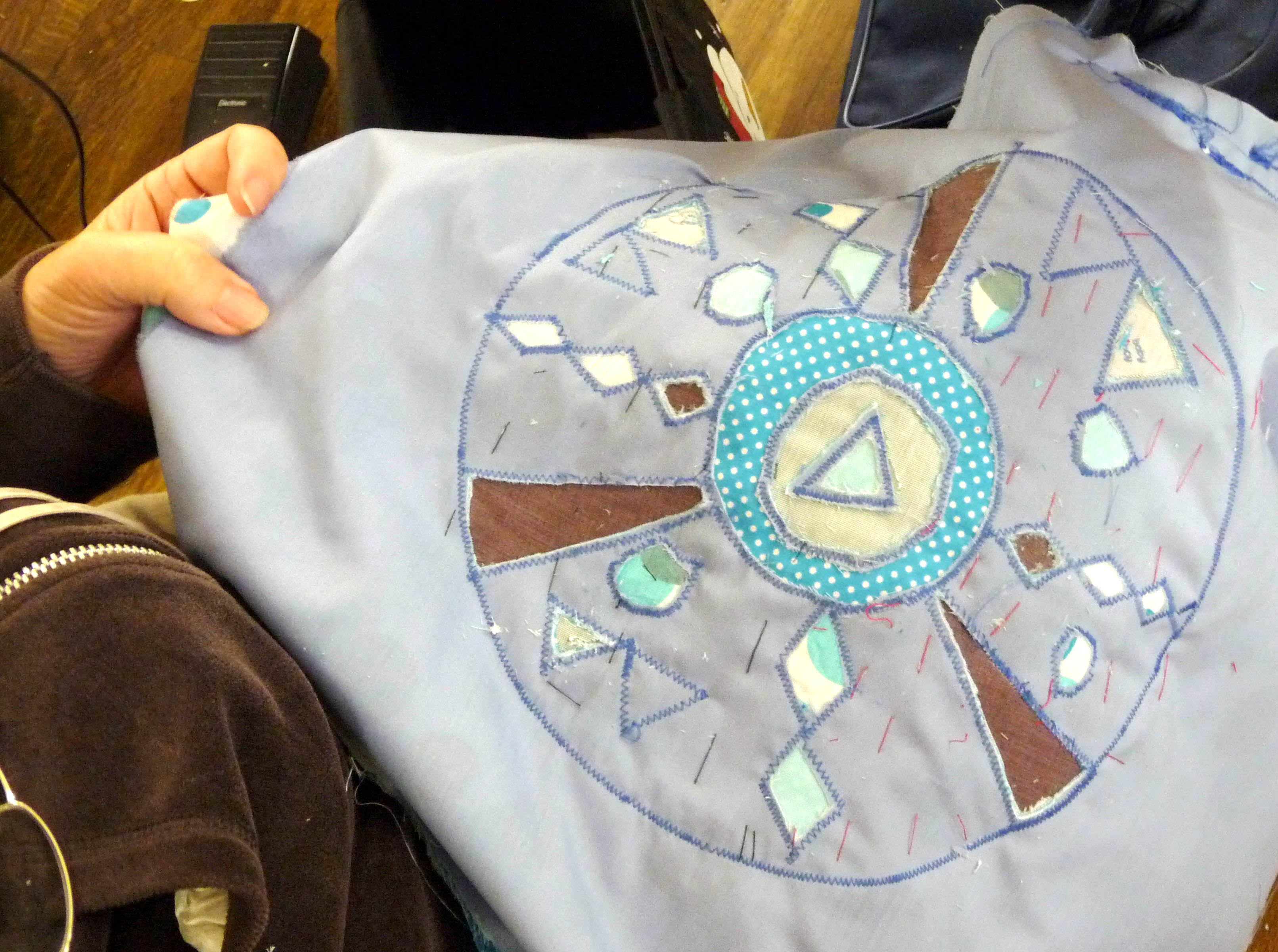 She started us off by drawing 6 petal shapes all the same on our dissolvable fabrics (solufleece) with a water soluble pen – the troubles started with the sewing machines.